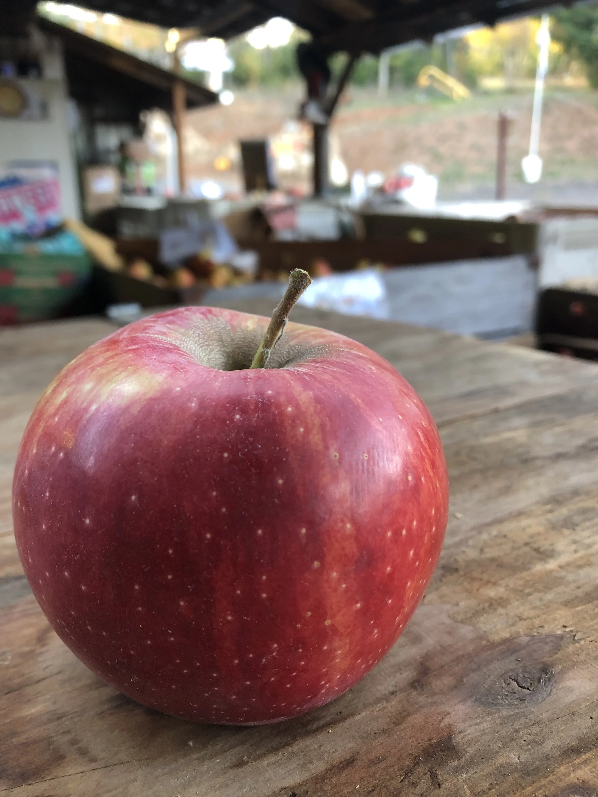 Fuji- Fuji is a popular eating apple. Great keeper. Mellow sweetness, snappy, refreshing-especially if chilled. Great to have a box in the garage for easy snacks or take to a job site to share.